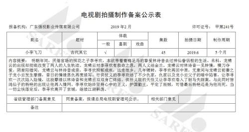 其中,改編劇本較多。古龍武俠小說《小李飛刀》又將翻拍,備案顯示,該劇將拍45集,制作周期5個月,將于2019年6月開拍,而劇情則與老版基本一致。