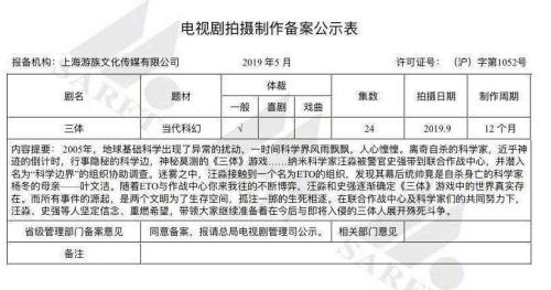 到了今年,國家廣播電影電視總局5月電視劇備案公示顯示,《三體》將被改編為電視劇,并已通過備案。電視劇將于9月開拍,共24集。