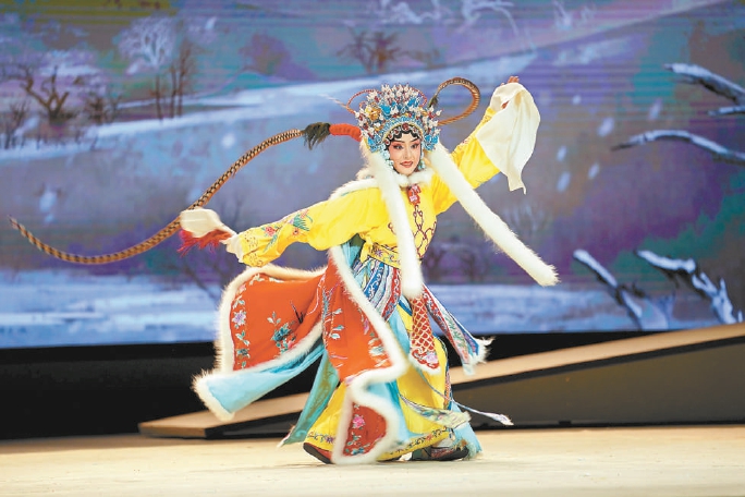 雖然以傳統(tǒng)戲為主,但是可以看出來這部戲力圖呈現(xiàn)四大美人與眾不同的一面。風雷京劇團團長松巖表示,他們希望不再是簡單地平面化呈現(xiàn)四大美人的外貌之美,而是要彰顯她們的精神之美,“從我個人情感來講,王昭君不只是一個簡單的美人,更是一個偉大的使者。”在舞臺呈現(xiàn)上,雖然有儀仗隊前來送行,但儀仗隊待在角落,王昭君則獨自站在風雪中,“她心里凄涼,但又懷著為祖國、為和平奉獻力量的熱情?!彼蓭r說,他希望通過京劇表演和音樂、多媒體手段的結合,讓觀眾不僅能夠欣賞京劇的唱念做打,還能感受到傳統(tǒng)京劇舞臺上感受不到的真情實景的氛圍。