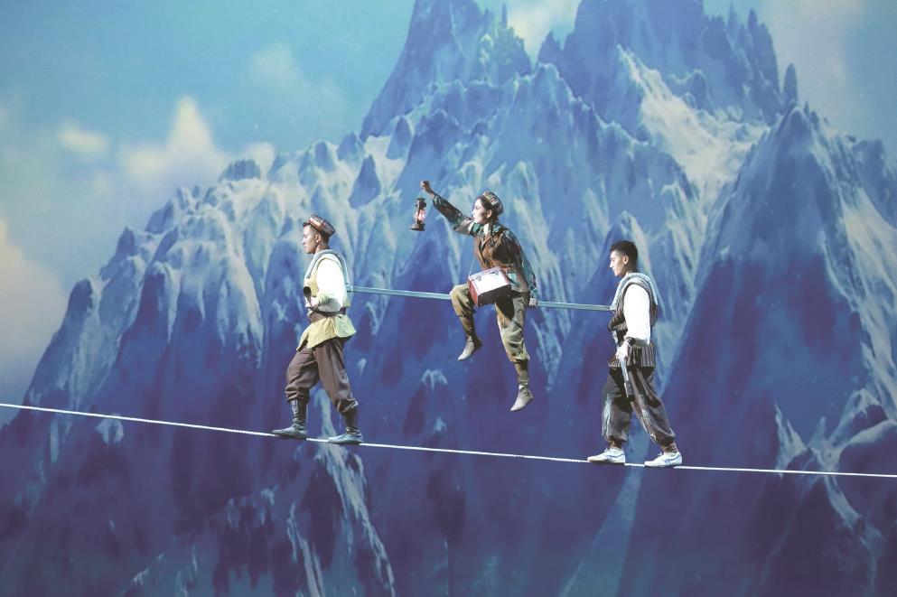 “雜技劇是雜技藝術(shù)發(fā)展非常重要的一個平臺,我們力求將人物的命運感更深切地融入雜技中?!弊蚯皟赏?,歷時三年打磨的雜技劇《天山雪》在上音歌劇院正式首演,這是海派雜技劇時隔四年后再次亮相中國上海國際藝術(shù)節(jié)?!短焐窖芬浴澳骘L飛翔”的“雄鷹精神”作為主旨,以雜技人的故事貫穿始終,串聯(lián)起70年來新疆各族人民共同建設(shè)新疆、發(fā)展新疆的壯美歷程,用雜技藝術(shù)語匯立體講述各族人民攜手奮進的故事。