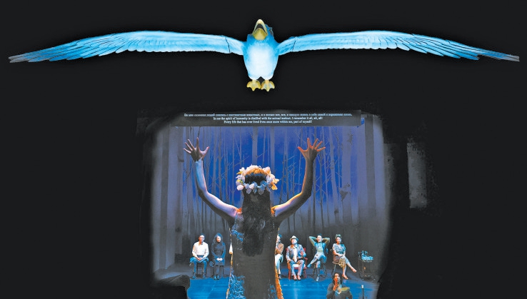 為了實現(xiàn)這一理念,劇組對舞臺進(jìn)行了大刀闊斧的改造,拆除了部分觀眾席座位,使得舞臺與觀眾席之間形成了一條真實的“路”。一只巨大的海鷗懸掛在觀眾席上方,成為連接現(xiàn)實與戲劇世界的紐帶。這種獨特的舞臺設(shè)計,讓每一位走進(jìn)劇場的觀眾可以看到一個與傳統(tǒng)鏡框舞臺截然不同的開放式空間,它打破了舞臺與觀眾席之間的界限,不僅營造出一種開放而沉浸的觀演環(huán)境,讓演員的表演更加自然流暢,也讓觀眾能夠更加近距離地感受到劇中人物的情感波動和命運變遷。