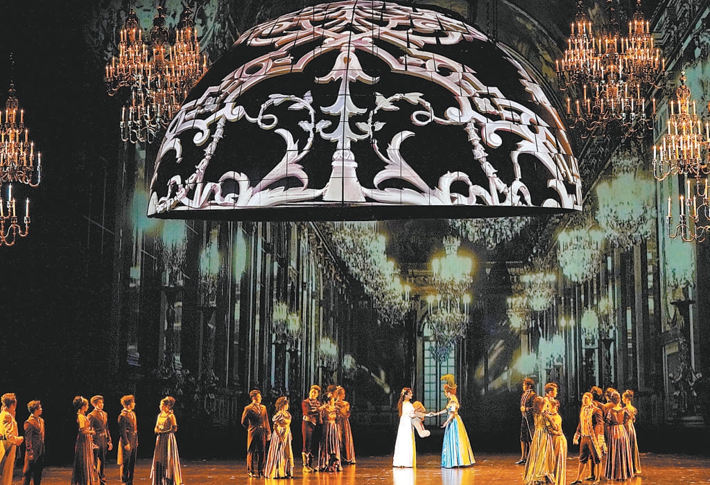 與壯闊宏大的作品立意相匹配的,是當?shù)闷鹑A美二字的舞臺呈現(xiàn)。璀璨的吊燈、長長的樓梯等鮮明意象不斷出現(xiàn),簡潔的布景與流動的影像虛實交織,把輝煌的宮廷、幽靜的鄉(xiāng)村、無垠的星空等場景營造得深邃動人。其中,由多塊LED屏拼成的圓弧最引人注目,在舞美設(shè)計維亞切斯拉夫·奧庫涅夫的解讀中,和平的寧靜短暫降臨時,圓弧可以隨影像變幻為宮殿穹頂、簡潔的花園涼亭,為生活遮風擋雨;戰(zhàn)爭襲來,刺目的紅光從破裂崩碎的圓弧中迸濺而出,恰如滿目瘡痍、生靈涂炭的現(xiàn)實。最終,幾瓣圓弧拼成碧水青山的“地球”,呼應(yīng)原著小說標題中的俄語單詞“Mip”,即“世界”,將作品的意境再次推上新的高點。
