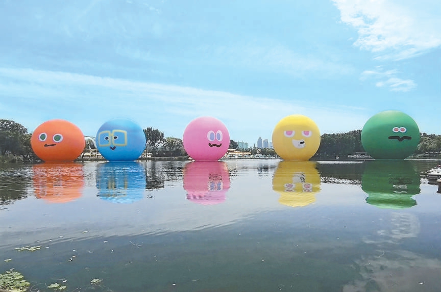 近日,朝陽公園北碼頭附近的湖面上新添五個10米高的充氣大球,粉色、黃色、綠色等不同顏色,對應的是樂隊組合五月天的不同成員,也與今年7月25日至8月9日,五月天在鳥巢舉辦演唱會的舞臺裝置遙相呼應。與此同時,樂隊成員的人物公仔也分別放置在居庸關長城、首鋼園、鼓樓廣場、798·751藝術區(qū)、亮馬河畔等地標景點。