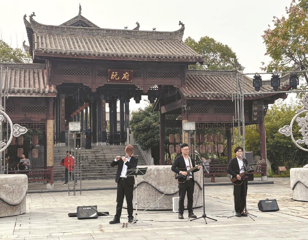 演藝新空間向外擴(kuò)展,蕪湖鳩茲小鎮(zhèn)內(nèi),上海街藝音樂組合正在演出。文匯報記者 孫彥揚攝