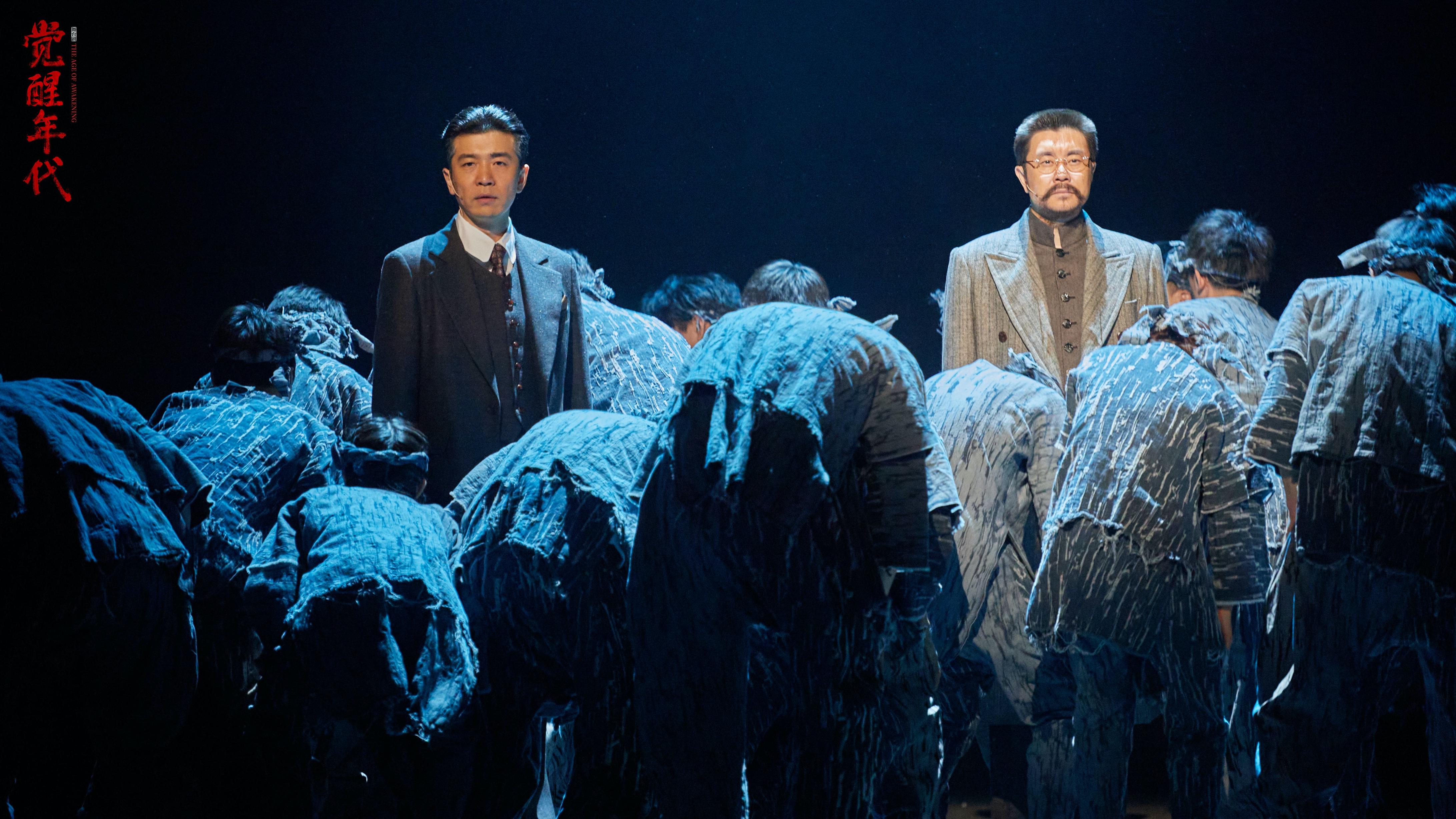 黑暗之中,地面之上,星火閃爍,“覺醒年代”四個大字醒目地投射在銹跡斑駁的鐵板上,兩面7.5米高的全機(jī)械數(shù)控轉(zhuǎn)臺緩緩展開,朦朧的煙霧環(huán)繞四周,一眾青年演員用極具張力的肢體語言透露著20世紀(jì)初陷入迷茫的中國現(xiàn)狀。李大釗、陳獨(dú)秀兩位革命先輩在憤怒與悲愴中登場,民族生死關(guān)頭,國家存亡之際,他們點(diǎn)燃了一群仁人志士的熱血與希望……