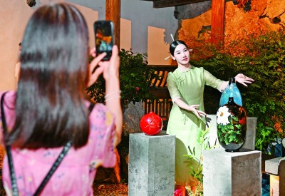 福建福州,觀眾在三坊七巷歷史文化街區(qū)參觀拍攝傳統(tǒng)漆器工藝品的沉浸式實(shí)景展示。新華社發(fā)