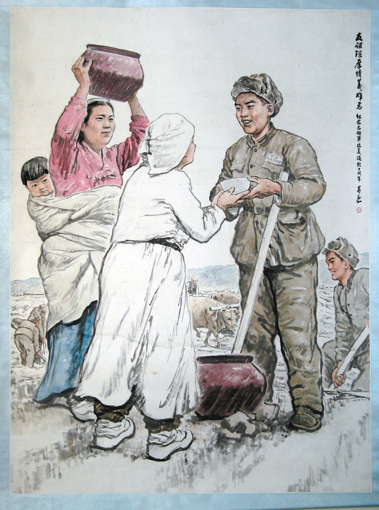 ??在展廳里,有一幅蔣兆和創(chuàng)作的中國畫《友誼深厚情義難忘》,畫中的“紀(jì)念志愿軍抗美援朝十周年”題跋道出了其創(chuàng)作的時間。畫面的主體是兩位朝鮮婦女正為志愿軍戰(zhàn)士送水,其中一位婦女還背著可愛的幼兒。在幾位主要人物的身后,畫家細(xì)致地描繪了志愿軍戰(zhàn)士們在農(nóng)田幫助朝鮮人民恢復(fù)農(nóng)業(yè)生產(chǎn)的場景。在中朝軍隊打退以美國為首的“聯(lián)合國軍”、朝鮮停戰(zhàn)協(xié)定簽訂后,志愿軍在鞏固防守的同時,還幫助朝鮮人民建設(shè)新家園,與朝鮮人民結(jié)下了深厚情誼。