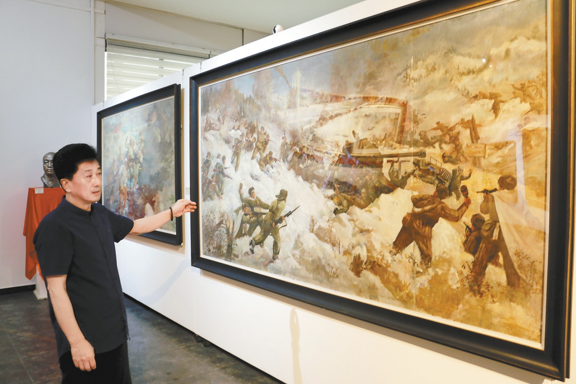 ??在朝鮮萬壽臺創(chuàng)作社美術(shù)館,還收藏著梁玉龍的《黃繼光》、柳青的《邱少云》等經(jīng)典作品。當(dāng)代新作方面,由中國畫家史國良與朝鮮功勛畫家金仁石合作的巨幅《勝利鼓聲》,融中國畫與朝鮮畫藝術(shù)于一體,畫里畫外都凝結(jié)著中朝兩國人民并肩戰(zhàn)斗的深厚友情?!俺r萬壽臺創(chuàng)作社美術(shù)館多次舉辦中朝友誼展,弘揚(yáng)偉大的抗美援朝精神和中朝友誼。先烈們的犧牲換來了珍貴的和平,當(dāng)年的藝術(shù)家們也是冒著生命危險,留下了那段歷史的佐證,這是我們不能忘卻的記憶。”吉正太說道。