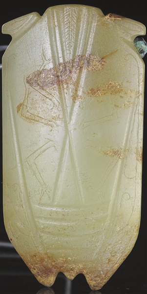 蟬是漢代玉器比較常見的一種題材。天博館藏西漢玉蟬,淡青色,質(zhì)地細密光潤。蟬形為扁平狀,中間稍厚。頭部的雙目外凸成方棱形,正面刻出雙翅,尾和翅端呈三角形狀,腹部刻出足紋。線條堅挺利落,細弱發(fā)絲,形象逼真,結(jié)構(gòu)準確。此蟬無鉆孔,當做專用的玉琀。