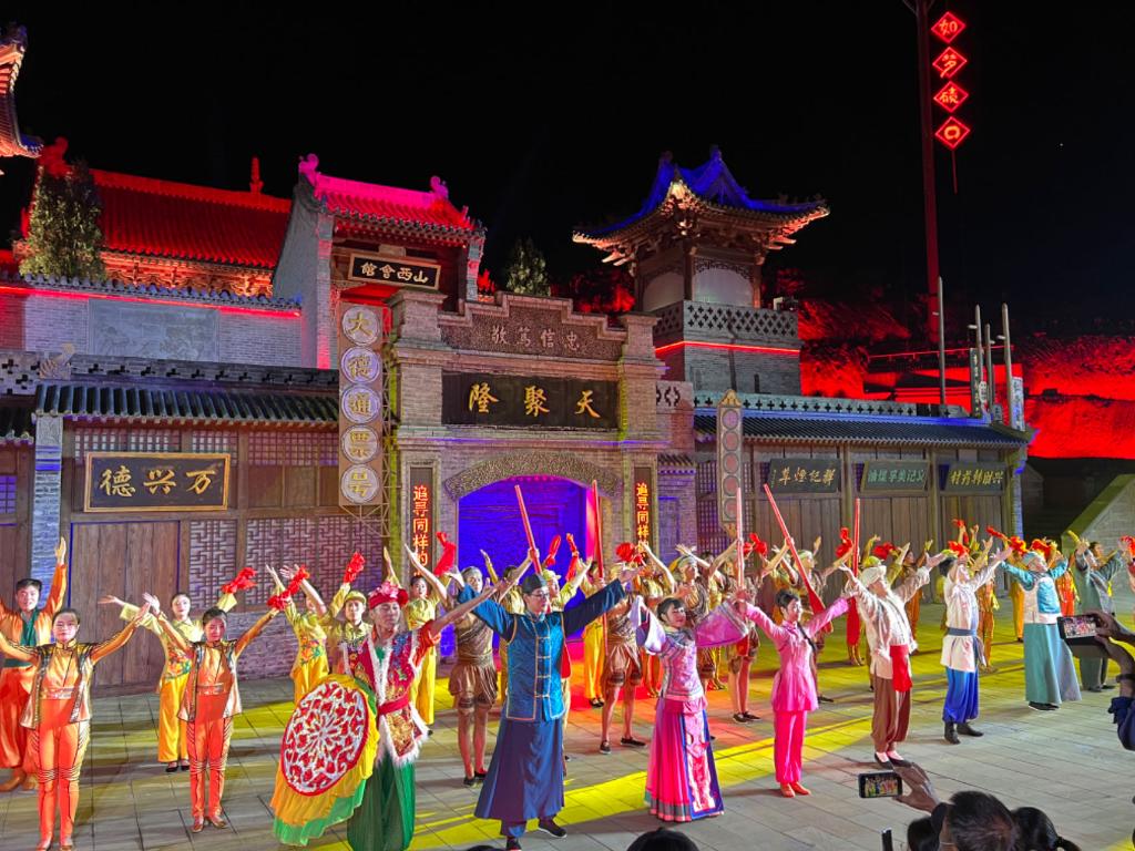 這是一場別樣的演出,山水和風(fēng)情在劇場里交相輝映。在“九曲黃河第一鎮(zhèn)”的磧口岸邊,在黃土高原呂梁山脈的懷抱里,觀眾坐在360度的露天旋轉(zhuǎn)觀演臺上,高科技舞臺技術(shù)和燈光投影矩陣的加持下,現(xiàn)代演藝手段和傳統(tǒng)文化相互融合。演員表演生動投入,將黃河文化、晉商文化、民俗文化、紅色文化潤于觀眾心中。
