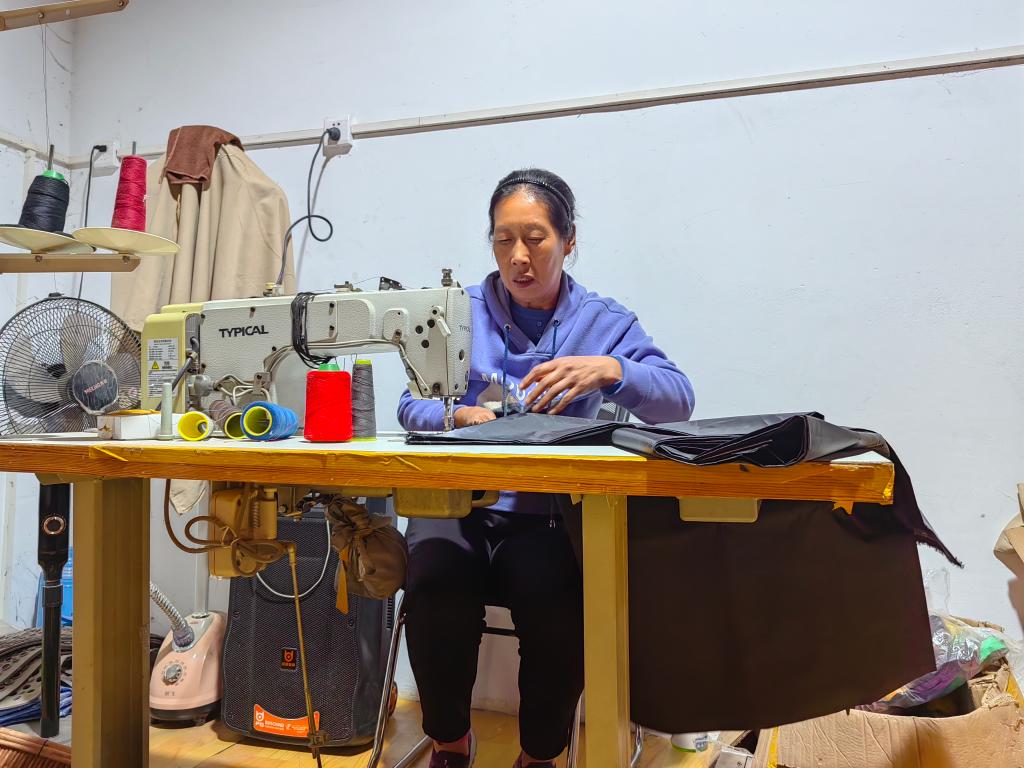 王能香在縫紉機(jī)前縫補(bǔ)演員的演出服裝。(新華社記者 馬曉潔 攝)