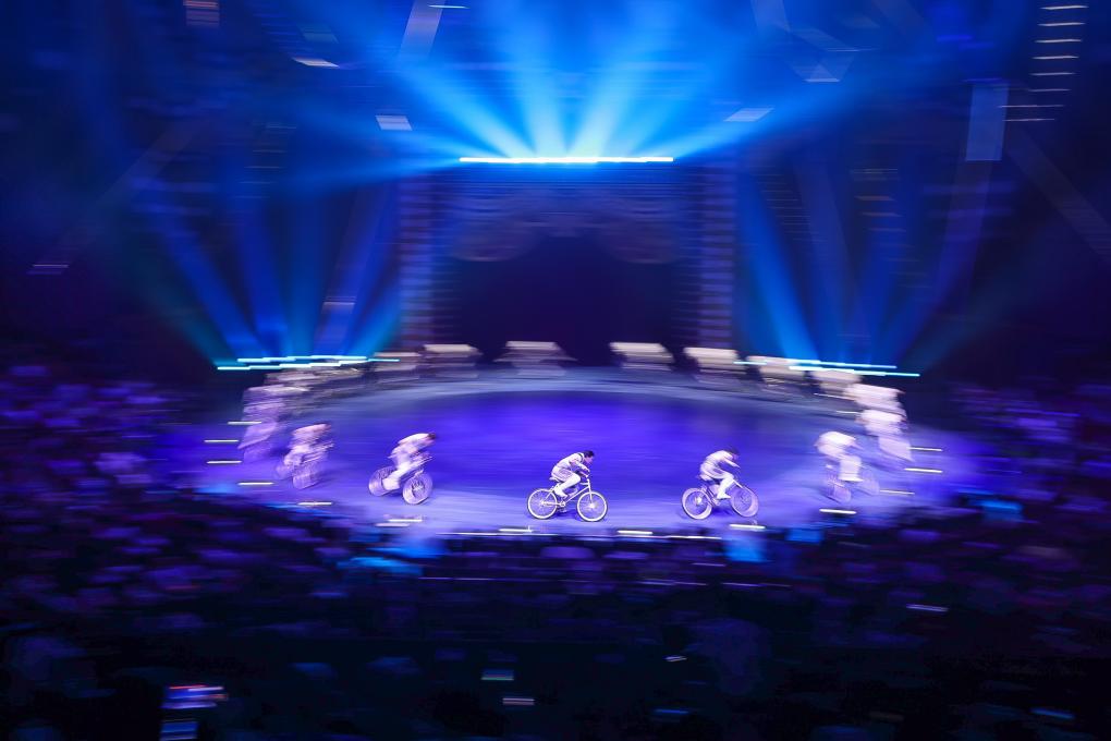 中國雜技團(tuán)演員表演創(chuàng)新節(jié)目“逐風(fēng)者·男子集體車技”,綜合運(yùn)用翻騰、頂功、拋接等技藝(11月5日攝)。新華社記者 劉大偉 攝