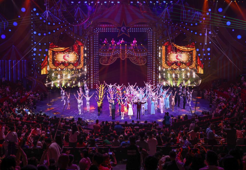 演員在第七屆中國國際馬戲節(jié)參演節(jié)目A場(chǎng)展演后集體謝幕(11月5日攝)。新華社記者 劉大偉 攝