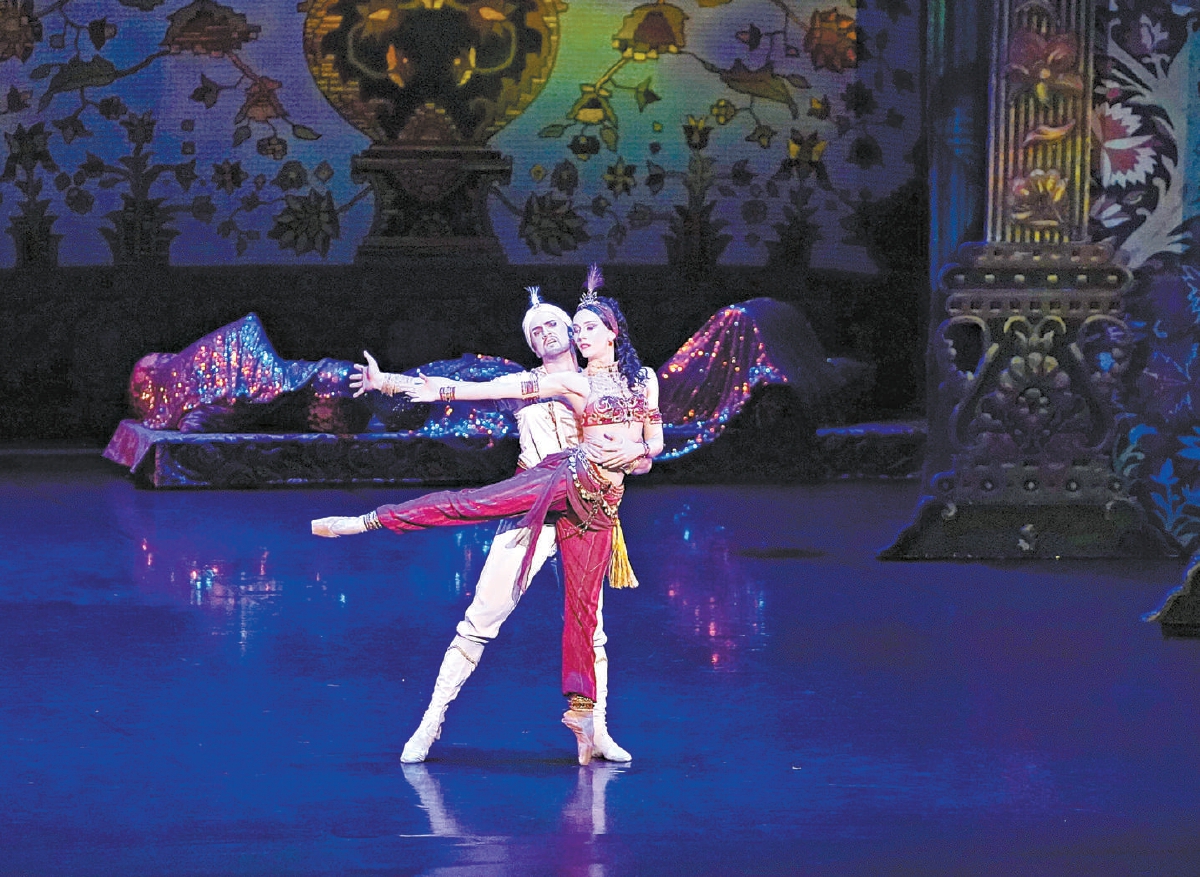 指揮家阿尤布·古利耶夫揮棒,打擊樂(lè)率先起勢(shì),以靈動(dòng)音色牽引出中央芭蕾舞團(tuán)交響樂(lè)團(tuán)演奏的異域旋律。濃郁的阿拉伯風(fēng)情從聽(tīng)覺(jué)延伸至雙眼,舞臺(tái)上,大幕升起,色彩圖案極盡斑斕的影像交織成一冊(cè)《一千零一夜》的圖書(shū),書(shū)頁(yè)翻動(dòng),故事流轉(zhuǎn),奇幻的傳說(shuō)走出圖畫,來(lái)到觀眾眼前。8月23日至25日,馬林斯基劇院芭蕾舞團(tuán)濱海分院攜芭蕾舞劇《一千零一夜》登臺(tái)北京藝術(shù)中心,向觀眾展開(kāi)了一個(gè)極致華麗璀璨的奇幻世界。