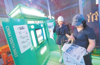 “時(shí)光照相館”自拍體驗(yàn)區(qū)里,觀眾可生成以自拍照為頭版新聞的“人藝之友報(bào)”。北京日?qǐng)?bào)記者 方非攝