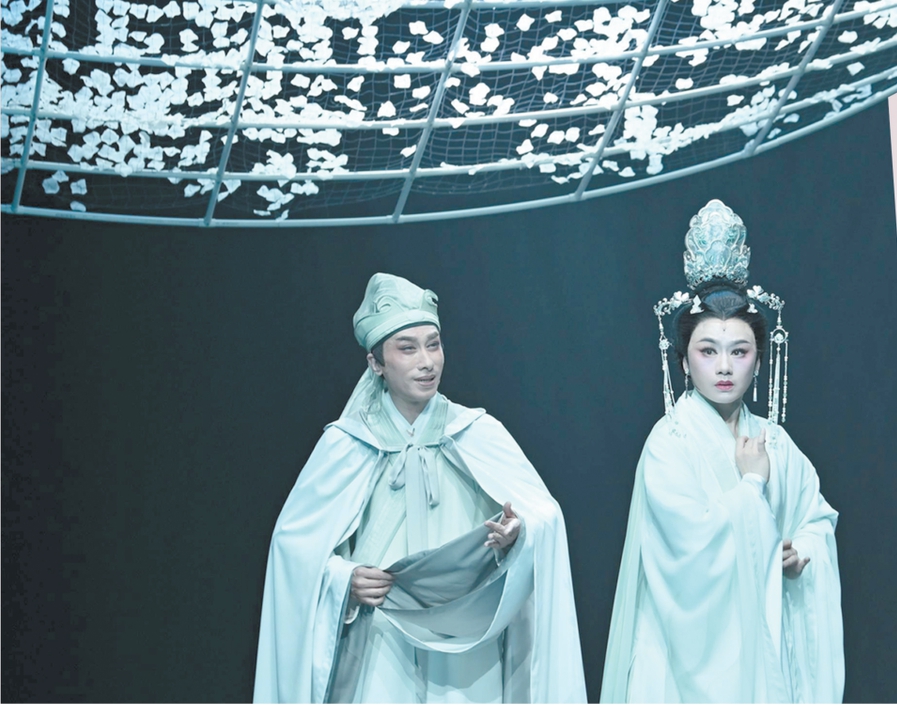 舞臺(tái)上,《帝女花》長(zhǎng)演不衰,多個(gè)劇團(tuán)進(jìn)行了重塑排演,其中不乏創(chuàng)新求變的探索。桃花源粵劇工作舍于2022年制作了《帝女花》65周年巡演版,并細(xì)分為管弦光影版、學(xué)生戲臺(tái)版等多個(gè)不同版本,激發(fā)觀眾的思考與想象。2024年,廣東粵劇院推出曾小敏、文汝清主演的小劇場(chǎng)粵劇《帝女花·一念》,在保留經(jīng)典唱段的基礎(chǔ)上做簡(jiǎn)化,嘗試注入新的時(shí)代氣息。劇中,曾小敏不僅飾演了戴花冠、著宮裝的長(zhǎng)平公主,還扮演了穿越古今的素衣女子,引領(lǐng)觀眾穿越古今,體驗(yàn)長(zhǎng)平公主的前世今生。