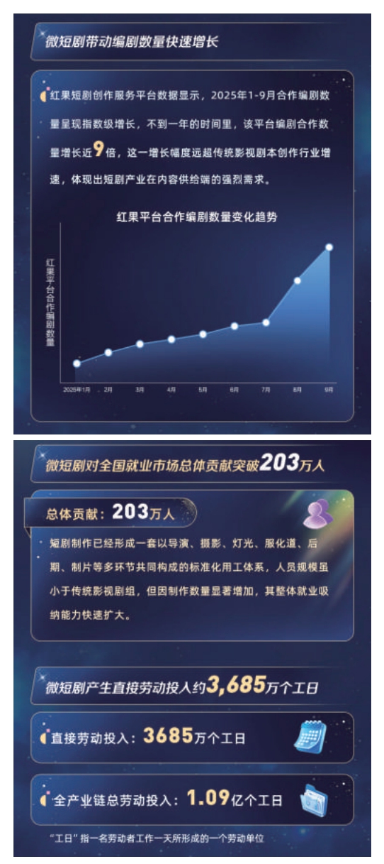 這不僅大幅提升了人力資源的利用效率,也為從業(yè)人員帶來了長期且穩(wěn)定的工作預(yù)期,吸引了大量人才涌入。以編劇為例,紅果短劇創(chuàng)作服務(wù)平臺數(shù)據(jù)顯示,2025年1-9月合作編劇數(shù)量呈現(xiàn)指數(shù)級增長,不到一年的時間里,平臺編劇合作數(shù)量增長近9倍,遠(yuǎn)超傳統(tǒng)影視劇本創(chuàng)作行業(yè)增速。