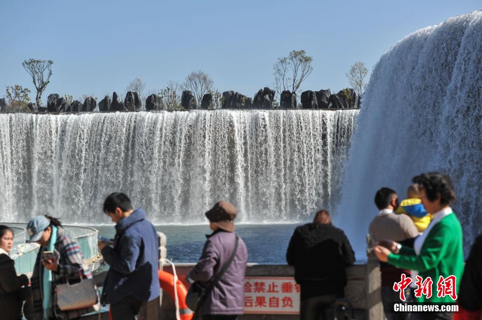 1月5日,游客在昆明瀑布公園內(nèi)游覽拍照。據(jù)了解,昆明瀑布公園1月1日開(kāi)始對(duì)民眾開(kāi)放,公園的瀑布利用牛欄江引水入滇工程而形成人工瀑布及湖泊,其利用約12.5米的地勢(shì)高差,建設(shè)成寬幅約400米的人工瀑布,是中國(guó)最大人工瀑布。 中新社記者 任東 攝