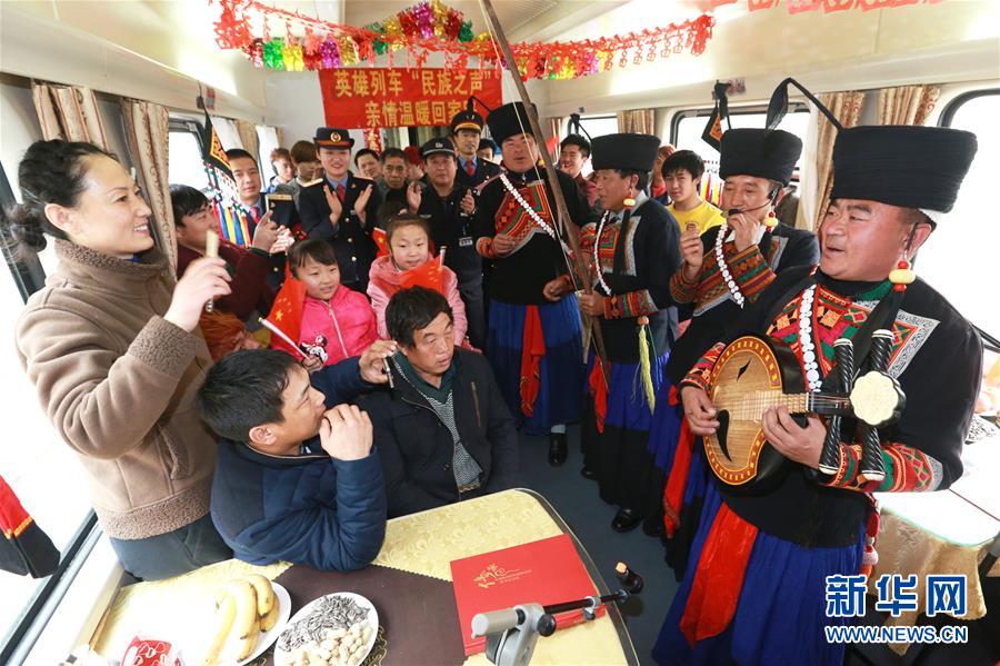 2月1日,彝族藝術(shù)家在K165次列車上為旅客表演。當(dāng)日,在西安鐵路局西安至昆明的K165次列車上,四川美姑縣原生態(tài)畢摩樂隊(duì)與西安客運(yùn)段職工民樂小分隊(duì)聯(lián)合舉辦“英雄列車民族之聲親情溫暖回家路”音樂會,畢摩樂隊(duì)用口弦、哈門、木葉、瑪布等彝族民間樂器演奏的音樂為返鄉(xiāng)過年的旅客提前送上新年祝福。民間藝術(shù)家和列車乘務(wù)員還為旅客們送上“?!弊?、春聯(lián)。新華社發(fā)