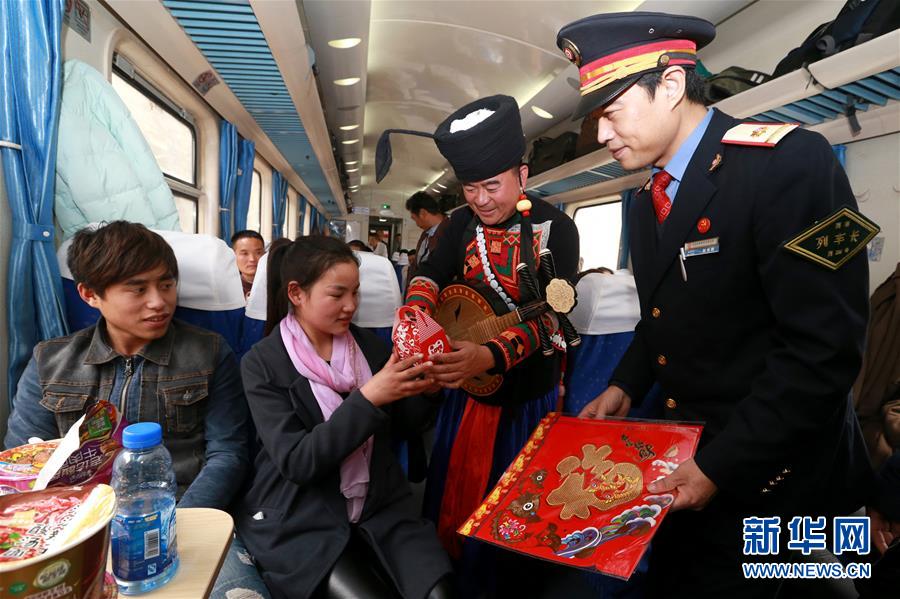 2月1日,彝族藝術(shù)家在K165次列車上為旅客表演。當(dāng)日,在西安鐵路局西安至昆明的K165次列車上,四川美姑縣原生態(tài)畢摩樂(lè)隊(duì)與西安客運(yùn)段職工民樂(lè)小分隊(duì)聯(lián)合舉辦“英雄列車民族之聲親情溫暖回家路”音樂(lè)會(huì),畢摩樂(lè)隊(duì)用口弦、哈門、木葉、瑪布等彝族民間樂(lè)器演奏的音樂(lè)為返鄉(xiāng)過(guò)年的旅客提前送上新年祝福。民間藝術(shù)家和列車乘務(wù)員還為旅客們送上“?!弊?、春聯(lián)。新華社發(fā)