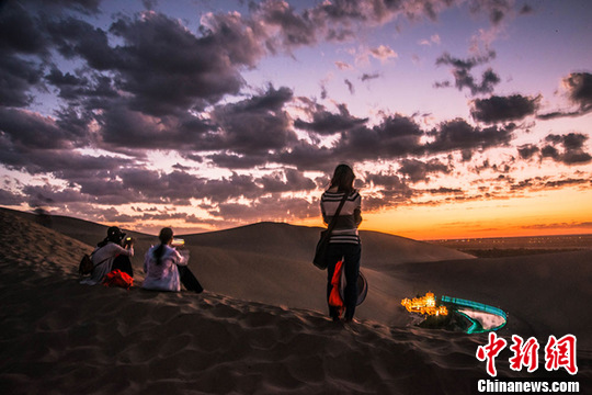 7月中旬,國際旅游名城甘肅敦煌進(jìn)入旅游旺季,每天成千上萬的海內(nèi)外游客來到當(dāng)?shù)刂Q沙山月牙泉景區(qū)觀光游覽,觀賞大漠風(fēng)光,感受敦煌文化,體驗(yàn)民俗風(fēng)情。傍晚時(shí)分,西邊的天空被晚霞染紅,美麗的月牙泉被寶藍(lán)色的燈光點(diǎn)綴著呈現(xiàn)出美輪美奐的闌珊夜色,大批游人沉浸于如夢如幻的迷人夜色里流連忘返。