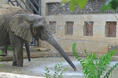 在大象展區(qū),寬敞的運(yùn)動(dòng)場(chǎng)地上,淋浴噴頭頗為顯眼,下方還有一個(gè)半米多深的水池,天氣熱的時(shí)候,大象可以邊淋浴邊戲水,時(shí)不時(shí)甩開長鼻子吸起水來為自己沖涼。運(yùn)動(dòng)場(chǎng)上還有兩個(gè)七八米高的草棚,沖完涼的大象可以躺在下面乘涼休息。