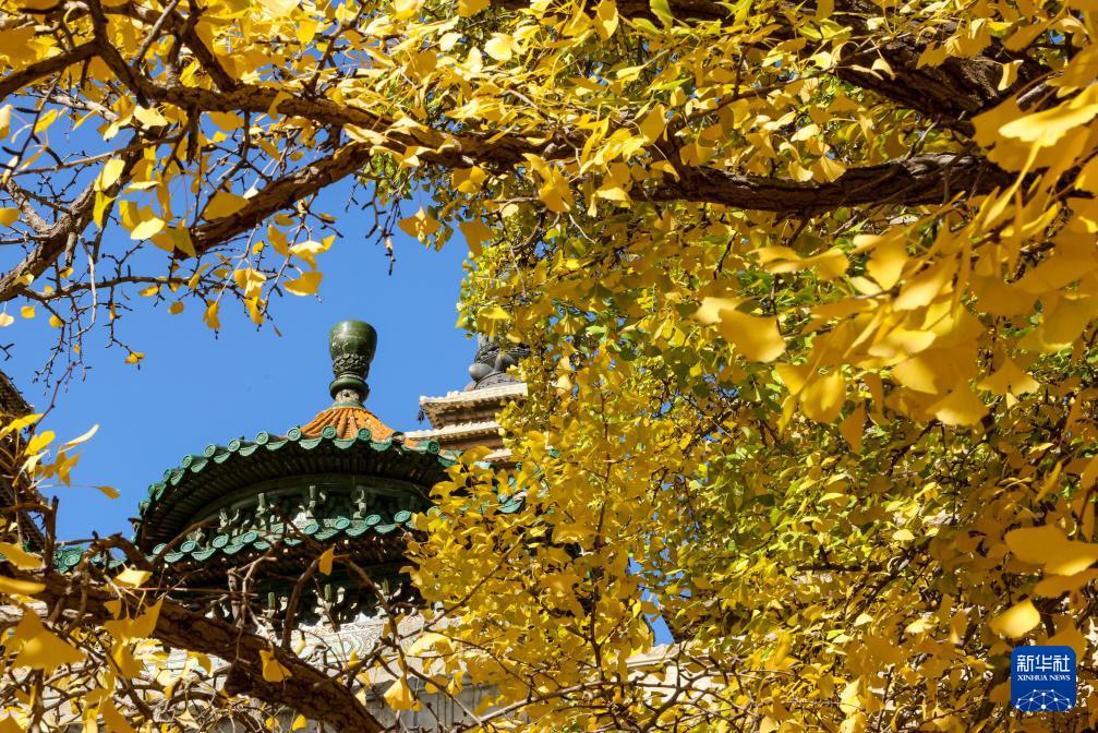 晚秋時節(jié),北京五塔寺院內(nèi)銀杏盡黃,吸引許多市民、游客賞秋游園。