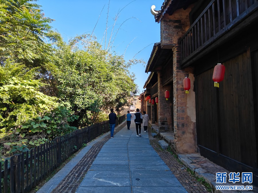 圖為游客在江口村古街上游覽。(新華網(wǎng)發(fā) 楊偉偉 攝)