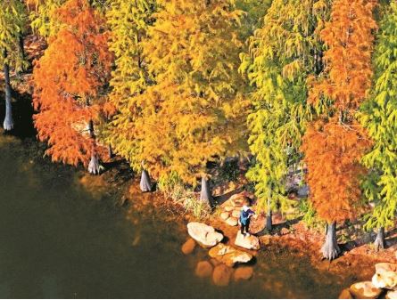 隨著天氣轉(zhuǎn)冷,廣西南寧市多個公園的杉樹樹葉愈發(fā)紅艷,分外靚麗。圖為12月21日,市民在廣西南寧市青秀山風(fēng)景區(qū)的杉樹林里游玩。 新華社記者 周華攝