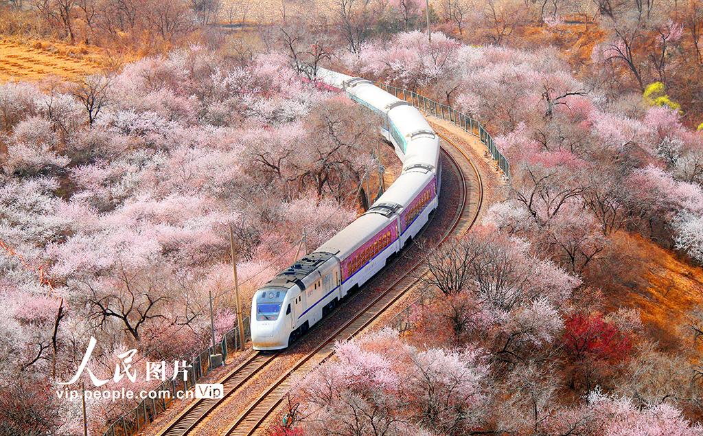 2025年3月23日,居庸關(guān)長(zhǎng)城腳下繁花似錦,北京市郊鐵路S2線列車悠然穿行其間,該線列車因途經(jīng)多處風(fēng)景名勝,被贊譽(yù)為“開往春天的列車”。張秀科攝(人民圖片網(wǎng))