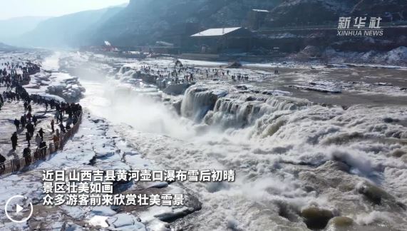近日,山西吉縣黃河壺口瀑布雪后初晴,景區(qū)壯美如畫,眾多游客前來欣賞壯美雪景。從空中俯瞰,瀑布仿佛披上了一層潔白的輕紗,黃河水夾雜著流凌從上游呼嘯而下,跌入十里龍槽,激起陣陣白色水霧,經陽光折射后,一道美麗的彩虹若隱若現,美不勝收。