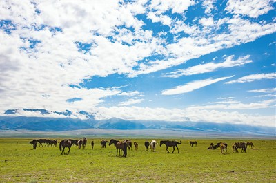 七月的新疆維吾爾自治區(qū)哈密市天山景區(qū),藍(lán)天、白云和綠色田野共同構(gòu)成一幅美景,置身其中,仿佛走進(jìn)奇美的畫卷,讓人感到無限愜意。