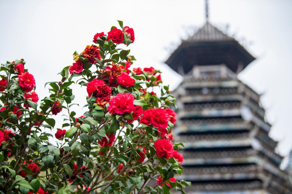 ?? 2024年3月10日,貴州省從江縣高增鄉(xiāng)占里侗寨內(nèi)盛開的茶花與鼓樓相映成景。CICPHOTO/吳德軍 攝