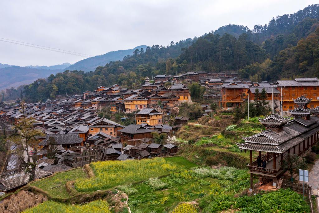 ?? 2024年3月10日,貴州省從江縣高增鄉(xiāng)占里侗寨內(nèi)盛開的油菜花與鼓樓、民居相映成景。CICPHOTO/吳德軍 攝