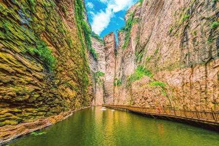 黃崖洞文化旅游區(qū)赤壁丹崖如屏如畫(huà),林蔭如蓋、疊瀑成群,吸引游客紛至沓來(lái)。張斌全攝