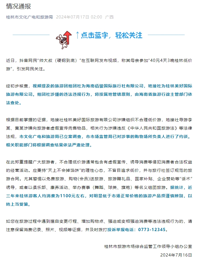 中新網(wǎng)7月17日電 桂林市文化廣電和旅游局官微發(fā)布情況通報,近日,抖音網(wǎng)民“帥大叔(硬鋼到底)”在互聯(lián)網(wǎng)發(fā)布視頻,稱其母親參加“40元4天3晚桂林低價游”,引發(fā)網(wǎng)民關(guān)注。 經(jīng)初步核查,視頻提及的旅游團組團社為海南佰駿國際旅行社有限公司,地接社為桂林美好國際旅游有限公司。組團社涉嫌的違法違規(guī)行為,將按屬地管轄原則,由海南省旅游行政主管部門依法查處。 根據(jù)目前掌握的證據(jù),地接社桂林美好國際旅游有限公司涉嫌組織不合理低價游,地接社導游李某、黃某涉嫌向旅游者虛假宣傳兜售物品,相關(guān)行為涉嫌違反《中華人民共和國旅游法》等法律法規(guī),市文化廣電和旅游局已立案調(diào)查,市市場監(jiān)管局已對涉事的購物場所負責人進行了約談。相關(guān)職能部門將根據(jù)調(diào)查結(jié)果依法嚴肅處理。 桂林市文化廣電和旅游局提醒廣大旅游者,不合理低價游通常包含有虛假宣傳、誘導消費等侵犯消費者合法權(quán)益的經(jīng)營活動。應秉持“天上不會掉餡餅”的理性心態(tài),不盲目追求低價,并與旅行社簽訂規(guī)范的旅游合同。尤其警惕以免費旅游、購物(會員)送旅游、旅游贈禮品、國家補貼、企業(yè)贊助等“話術(shù)”誘導,或者以俱樂部、康養(yǎng)活動、舉辦賽事(舞蹈、球類、旗袍)等名義組團旅游。據(jù)統(tǒng)計,近三年來桂林游客人均消費為1100元左右,對明顯低于市場正常價格的旅游產(chǎn)品須謹慎辨別,以防上當受騙。