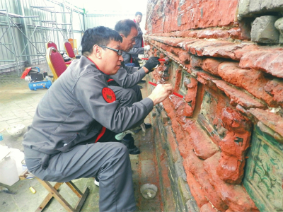 專家正在對四龍壁進行修復(fù)。解州關(guān)帝廟文物保護所供圖