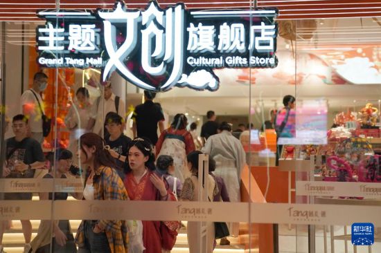 游客在西安大唐不夜城一家文創(chuàng)店內(nèi)購物游覽(5月20日攝)。