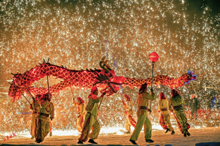 除了誘人的美食,精彩演藝必不可少?!靶麓貉灿巍钡慕k麗花車流光溢彩,演員們身著精致華麗的服飾載歌載舞,與游客熱情互動(dòng)。限定非遺“祈?;ɑ鹦恪备菐硪粓鲆曈X盛宴,“鐵樹銀花落,萬點(diǎn)星辰開”,火龍鋼花與落花秀相互交融,鐵火流星漫天飛舞,一起感受跨越千年的祝福與熾熱。還有“鬧新春”主題晚會(huì),歌舞、雜技輪番上演。廣大游客還可在歡聲笑語中圍著篝火牽手狂歡,共度闔家團(tuán)圓的美好時(shí)光。