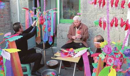 記者在現(xiàn)場(chǎng)看到,制作好的炮燈上有飄帶、繡球等裝飾,每盞炮燈不盡相同,畫(huà)有禾苗、動(dòng)物等不同圖案,寓意五谷豐登、六畜興旺,“孔雀展翅”“雄羊抵頭”“駿馬奔馳”等主題的炮燈活靈活現(xiàn)?!霸谖业挠洃浝?,我們村年年都有制作手工炮燈的傳統(tǒng),保存好的炮燈能用上兩年,燈架能代代相傳,我們有義務(wù)將這種技藝傳承發(fā)揚(yáng)下去……”67歲的村民翟慶如是村里制作炮燈的“行家”,他現(xiàn)場(chǎng)拿起一張彩紙給記者折起了炮燈上的裝飾。