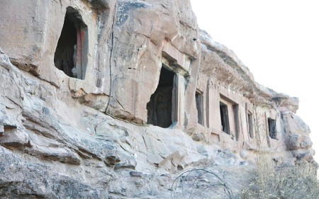 進入寺院抬頭仰望,距現(xiàn)地表高約10米的山體上由北向南排列著九座石窟??傮w特征皆平面方形,窟頂上部外立面存有窟檐橡孔。沿山崖堆積的土丘登高看到,每窟面積約為2平方米,四壁垂直,頂部為平頂或略帶弧度。第一、三、五窟門楣雕有火焰紋裝飾,門楣內雕飛天或花卉,門兩側設方形石柱或八棱束蓮柱。一至六窟平面呈長方形,平頂,四壁平直;七至九窟呈長方形,拱券頂;中間一孔入口兩側還刻有石雕小獸,造型生動。9窟中除第8窟為未完工的窟室和第7窟推測為僧房窟外,余下的窟俱為佛殿窟。窟內三面石壁上都刻有佛像,設低壇。四壁三龕,每龕一佛二菩薩或一佛二弟子,造像面相豐潤、頤頰飽滿。雖年久失修,風化嚴重,但仍能從中領略幾分豪邁灑脫的大唐風韻。三至六窟外壁存摩崖碑3通,均為螭首,碑文漫漶不清。據(jù)摩崖碑上“……歲次丁丑七月辛酉朔十五日乙亥建立”字跡記載,雕造于唐儀鳳二年(公元677年)。