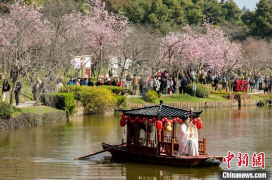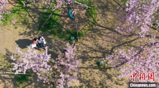 3月18日,游客在武漢東湖櫻花園賞櫻。中新社記者 張暢 攝