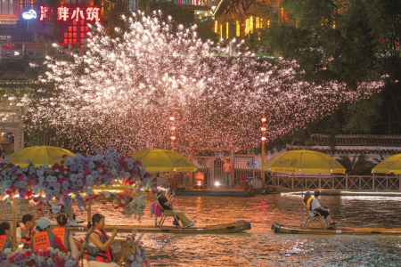 7月9日,游客乘坐“龍游貢水”竹筏在貢水河上觀賞打鐵花表演。位于湖北省恩施土家族苗族自治州的宣恩縣城是一座“景城一體·主客共享”的國家4A級景區(qū)。近年來,當(dāng)?shù)夭粩嗤脐惓鲂碌摹褒堄呜曀敝穹ぁ跖翊润w驗和觀賞項目,讓游客在璀璨燈火中沉浸式感受山區(qū)小城的夜色魅力。