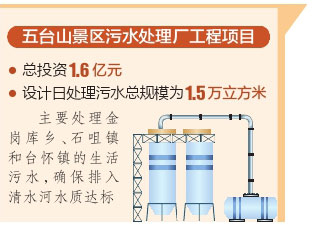 五臺山景區(qū)污水處理廠工程項目總投資1.6億元,設計日處理污水總規(guī)模為1.5萬立方米,主要處理金崗庫鄉(xiāng)、石咀鎮(zhèn)和臺懷鎮(zhèn)的生活污水,確保排入清水河水質(zhì)達標。