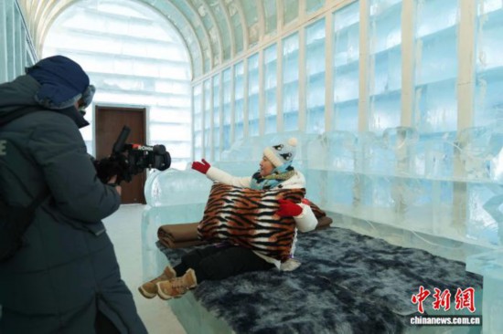 冰堡體驗休息室布置了冰床、冰沙發(fā)等冰制陳設(shè),讓游客沉浸式體驗冰雪住宿的新奇樂趣。 趙宇航 攝