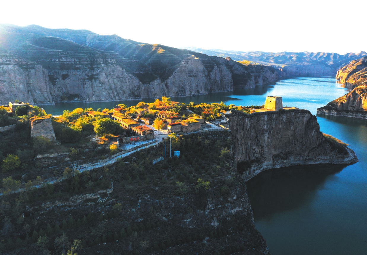 2015年的夏天,我又一次來到老牛灣,105米高的萬家寨水電大壩飛跨晉蒙,黃河水在絕壁中安靜了、變綠了。老牛灣村前的小河倒灌進(jìn)了黃河水,一個灣成了兩個灣,團(tuán)團(tuán)地圍住了山村,又好似老牛彎出了兩個碧綠的牛角,太漂亮了。老鄉(xiāng)們說:“有企業(yè)來開發(fā)道路、景區(qū)了,也有北京游客開車來游玩了,拍照的多,照幾張相就走了。”望著那仍然殘破的門樓和石板院房,我不知該說什么、能說什么。