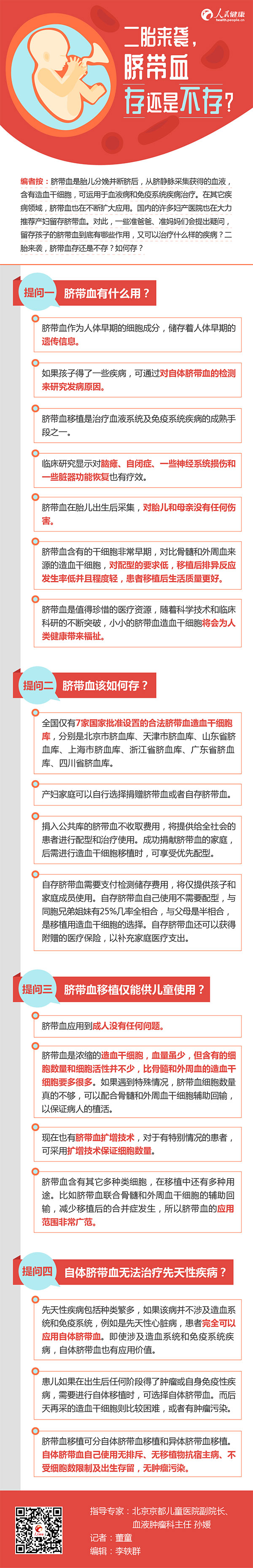 編者按:臍帶血是胎兒分娩并斷臍后,從臍靜脈采集獲得的血液,含有造血干細(xì)胞,可運(yùn)用于血液病和免疫系統(tǒng)疾病治療。在其它疾病領(lǐng)域,臍帶血也在不斷擴(kuò)大應(yīng)用。國內(nèi)的許多婦產(chǎn)醫(yī)院也在大力推薦產(chǎn)婦留存臍帶血。對此,一些準(zhǔn)爸爸、準(zhǔn)媽媽們會提出疑問,留存孩子的臍帶血到底有哪些作用,又可以治療什么樣的疾???二胎來襲,臍帶血存還是不存?如何存?