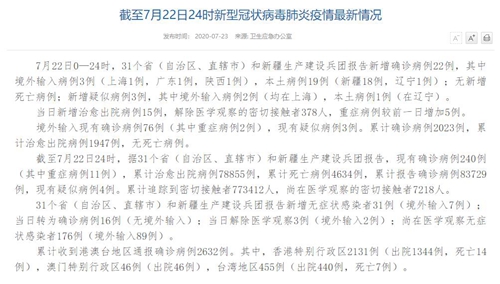 人民網(wǎng)北京7月23日電(董童)國(guó)家衛(wèi)生健康委于今日在官網(wǎng)發(fā)布的《截至7月22日24時(shí)新型冠狀病毒肺炎疫情最新情況》(以下簡(jiǎn)稱“情況”)提出,7月22日0—24時(shí),31個(gè)?。ㄗ灾螀^(qū)、直轄市)和新疆生產(chǎn)建設(shè)兵團(tuán)報(bào)告新增確診病例22例,其中境外輸入病例3例(上海1例,廣東1例,陜西1例),本土病例19例(新疆18例,遼寧1例);無(wú)新增死亡病例;新增疑似病例3例,其中境外輸入病例2例(均在上海),本土病例1例(在遼寧)。當(dāng)日新增治愈出院病例15例,解除醫(yī)學(xué)觀察的密切接觸者378人,重癥病例較前一日增加5例。