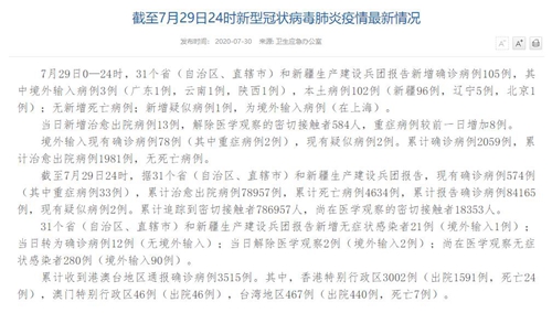 人民網北京7月30日電(董童)國家衛(wèi)生健康委于今日在官網發(fā)布的《截至7月29日24時新型冠狀病毒肺炎疫情最新情況》(以下簡稱“情況”)提出,7月29日0—24時,31個?。ㄗ灾螀^(qū)、直轄市)和新疆生產建設兵團報告新增確診病例105例,其中境外輸入病例3例(廣東1例,云南1例,陜西1例),本土病例102例(新疆96例,遼寧5例,北京1例);無新增死亡病例;新增疑似病例1例,為境外輸入病例(在上海)。當日新增治愈出院病例13例,解除醫(yī)學觀察的密切接觸者584人,重癥病例較前一日增加8例。