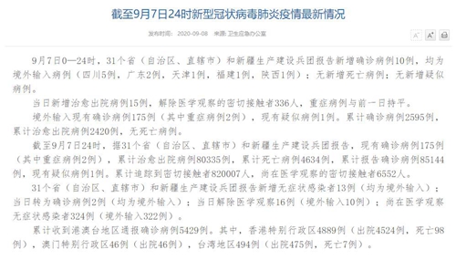 人民網(wǎng)北京9月8日電(董童)國家衛(wèi)生健康委于今日在官網(wǎng)發(fā)布的《截至9月7日24時新型冠狀病毒肺炎疫情最新情況》(以下簡稱“情況)”提出,9月7日0—24時,31個?。ㄗ灾螀^(qū)、直轄市)和新疆生產(chǎn)建設(shè)兵團報告新增確診病例10例,均為境外輸入病例(四川5例,廣東2例,天津1例,福建1例,陜西1例);無新增死亡病例;無新增疑似病例。當日新增治愈出院病例15例,解除醫(yī)學(xué)觀察的密切接觸者336人,重癥病例與前一日持平。